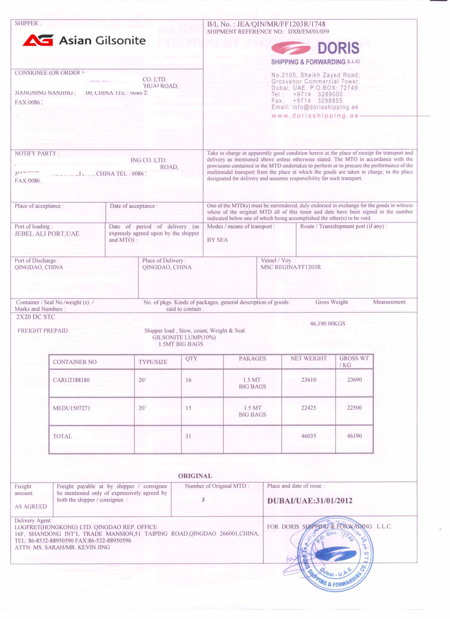 | Loading Port | Jebel Ali |