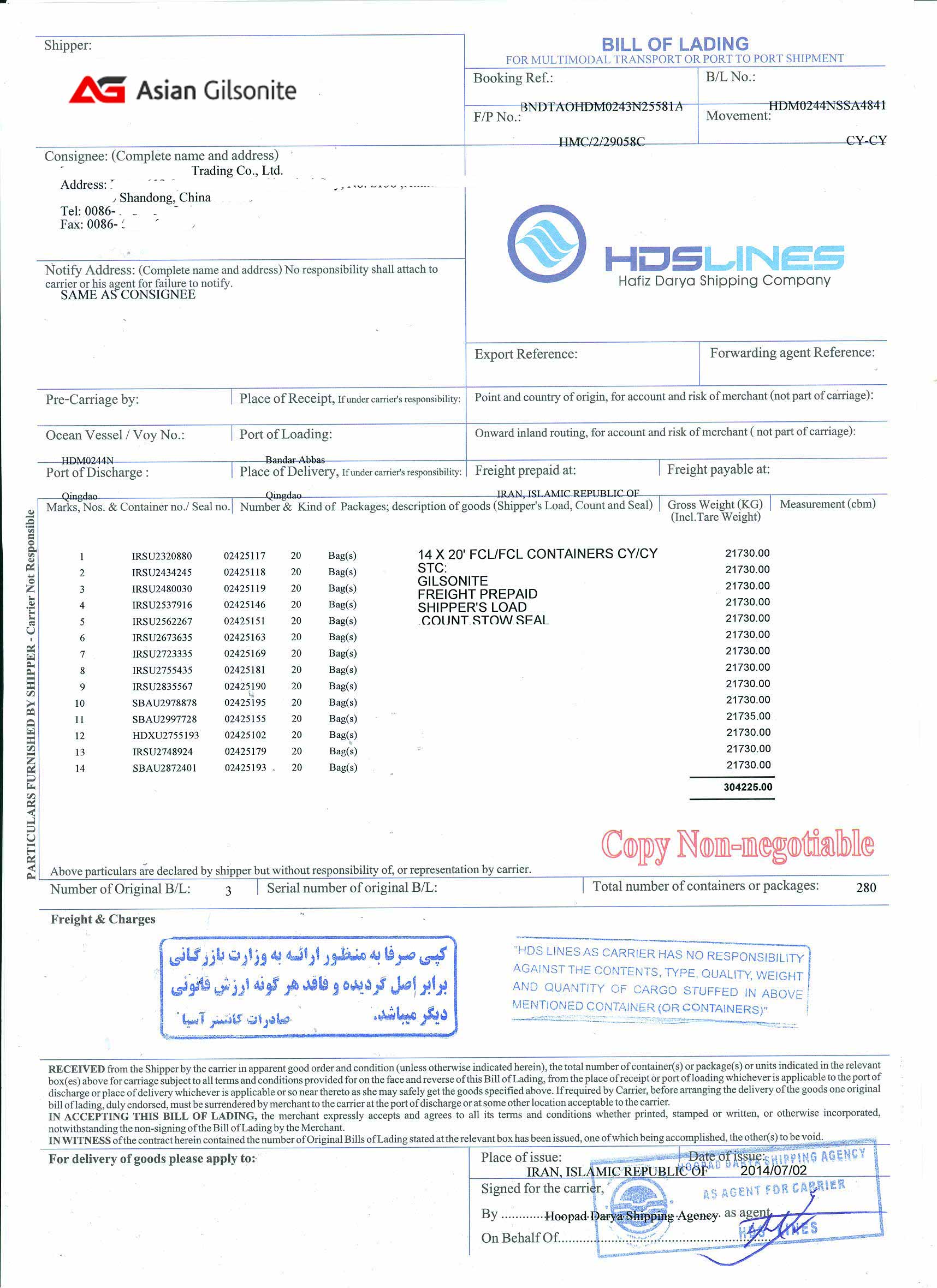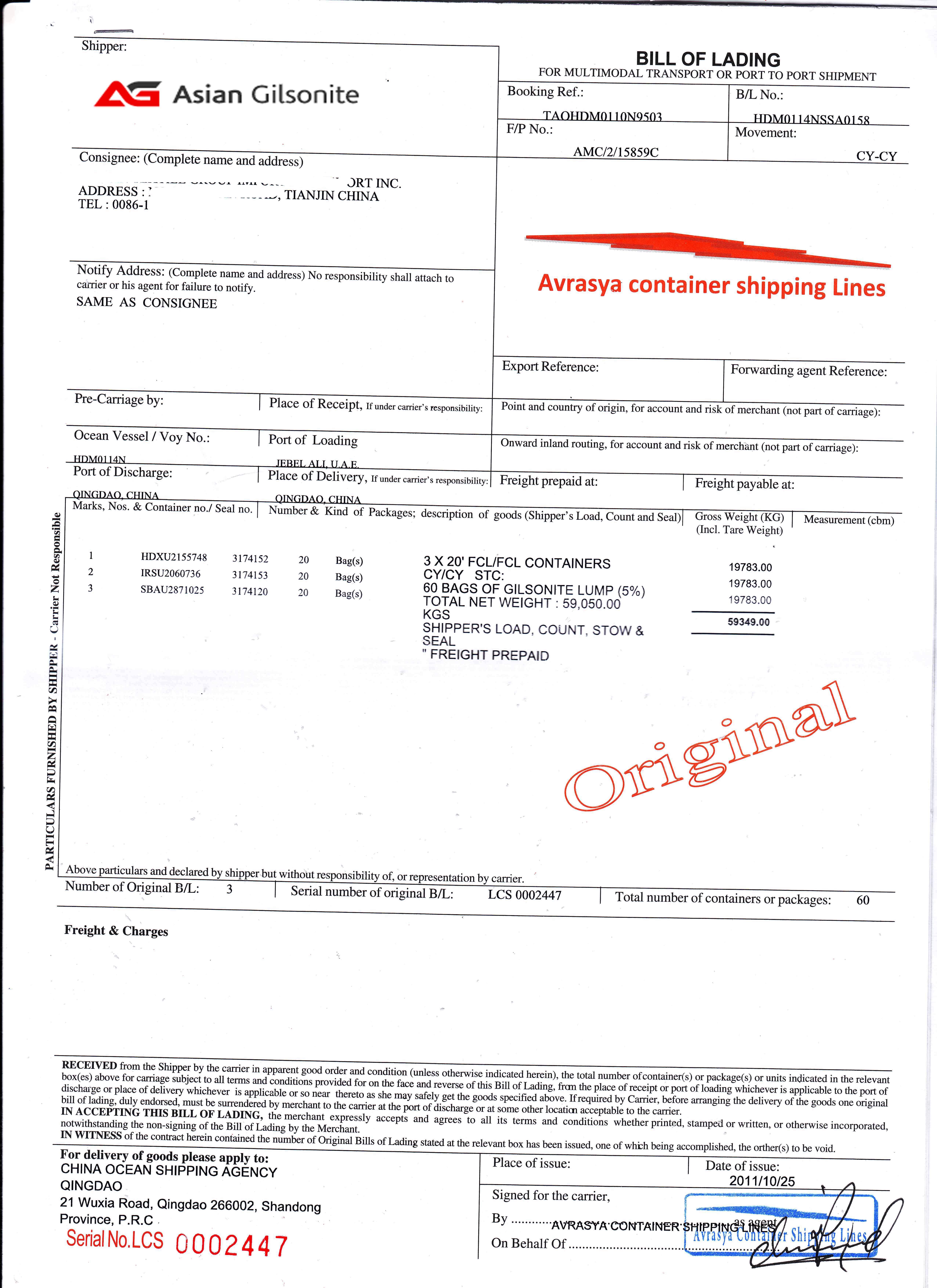 | Ports of Discharge | Shanghai, Nansha, Qingdao, Xingang |
